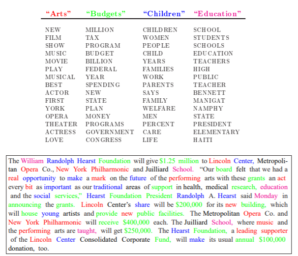 Below, have a look at one examplary output of a LDA, provided by Blei et al. in their paper. The corpus here consists of news articles, while the graph below shows one examplary document. By calculating a LDA the authors find 4 topics (which they labelled Arts, Budgets, Children and Education). The upper part of the graph displays those 4 topics with their respective most common words. Consider, that each column here only shows some of the top words.
